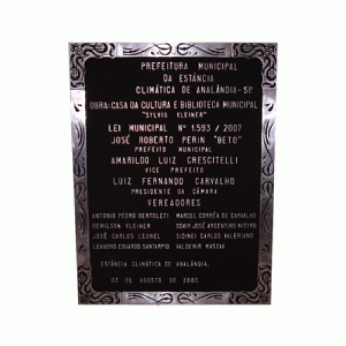Contendo: Placa para patrimônios com borda trabalhada. Mensagem a ser escolhida pelo cliente.