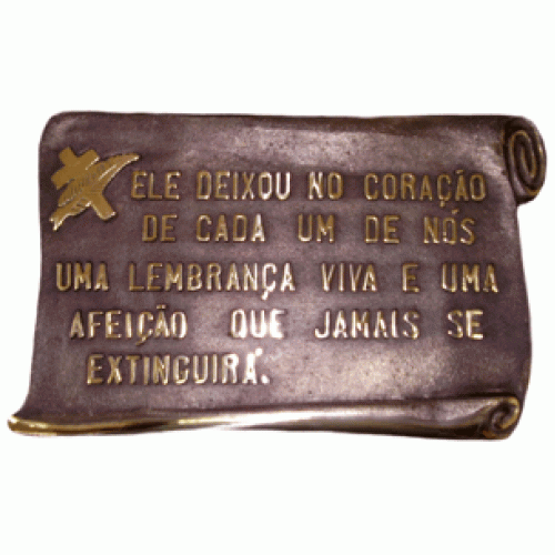 Contendo: Placa do tipo Pergaminho mensagem e detalhe de cruz e folha de trigo.